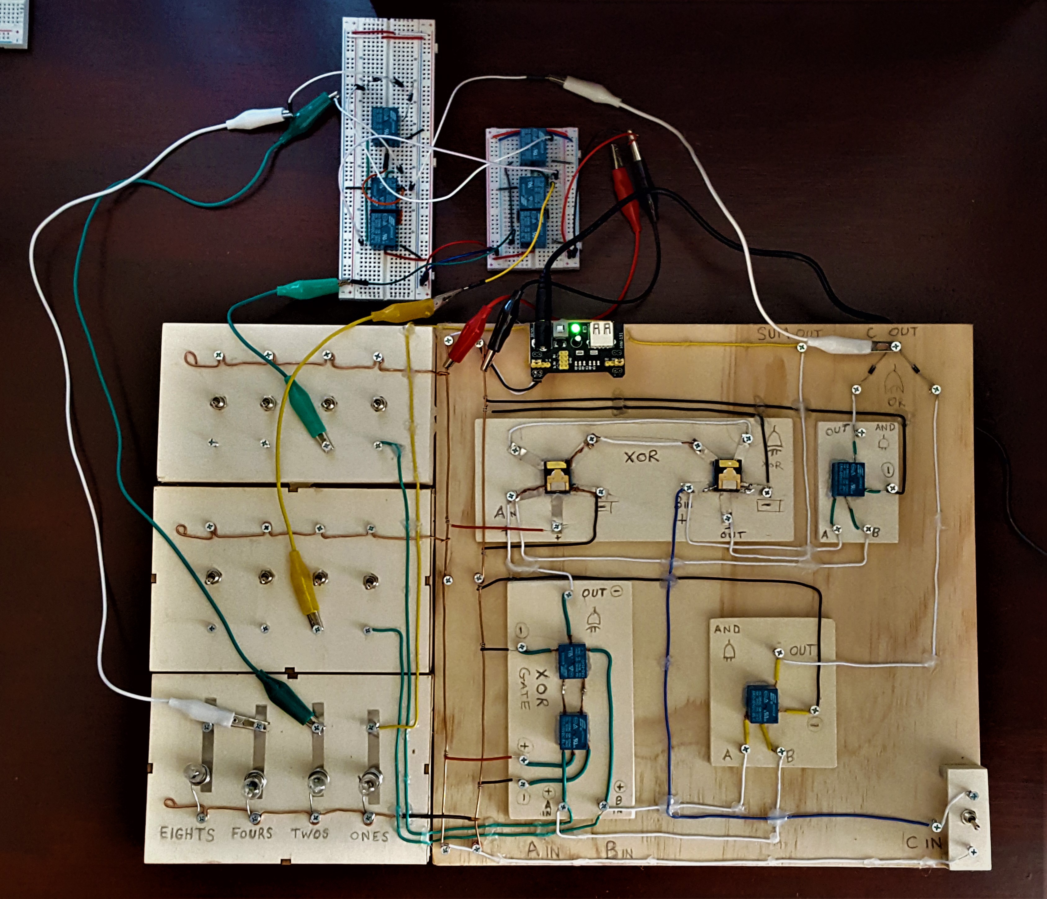 2 Bit Adder Using 5 Volt Relays, Switches, and Bulbs